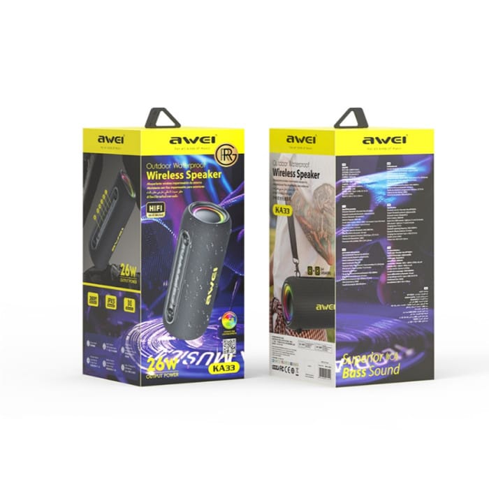 The Awei KA33 Waterproof Bluetooth Speaker combines strong 26W audio performance, modern RGB lighting, reliable battery life, and IPX5 water resistance to deliver an impressive portable sound experience.